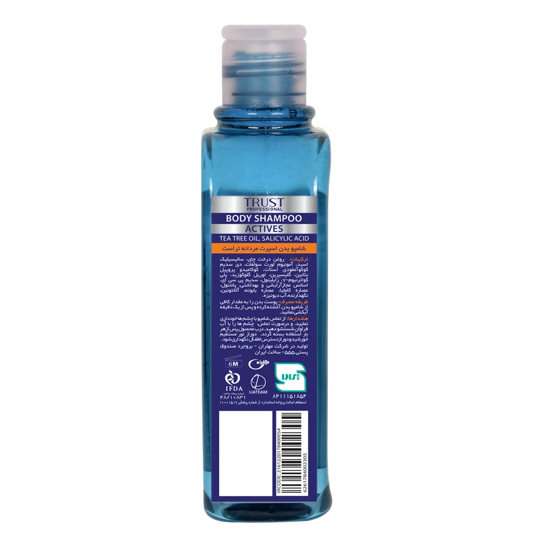 شامپو بدن اسپرت مردانه تراست، حاوی منتول و زینک PCA در ساختار خود بوده و با کنترل میزان تعریق بدن، از تکثیر باکتریها روی پوست جلوگیری کرده و حس خنکی و طراوت به آن میبخشد. این محصول گزینه مناسبی برای استحمام بعد از ورزش است.