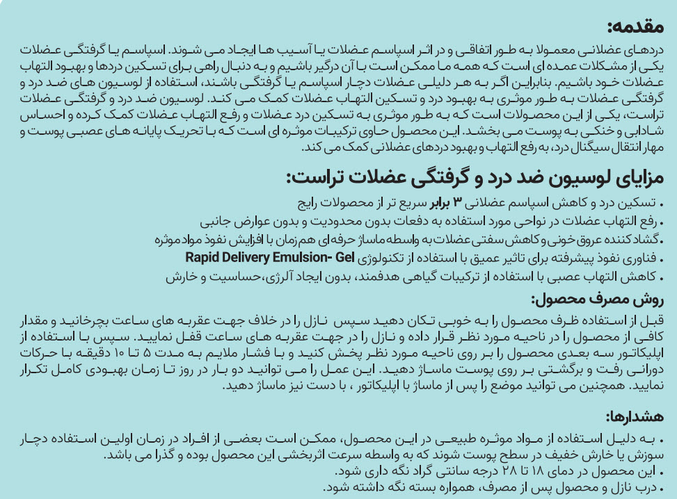 تسکین درد و کاهش اسپاسم عضلانی بهبود التهاب پوست در نواحی مورد استفاده گشاد کننده عروق خونی و کاهش سفتی عضلات فناوری نفوذ پیشرفته برای تاثیر عمقی کاهش التهاب عصبی با استفاده از ترکیبات گیاهی هدفمند
