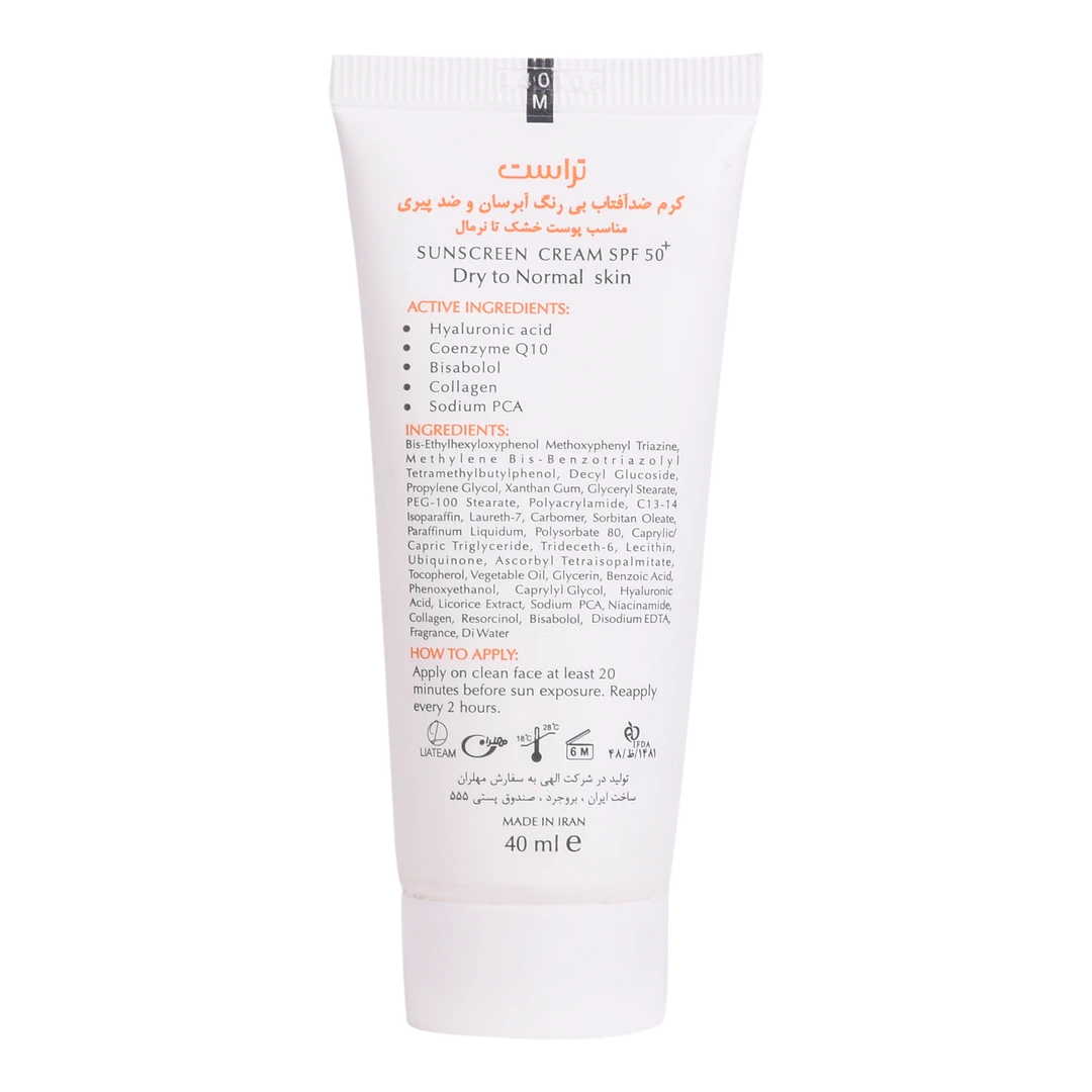 کرم ضدآفتاب و ضدپیری SPF +50 تراست، با استفاده از مرغوبترین و جدیدترین مواد اولیه همچون هیالورونیک اسید و کوآنزیم کیوتن از پوست شما دربرابر پرتوهای مضر آفتاب به طور کامل محافظت میکند. این کرم علاوه بر مهار رادیکالهای آزاد و محافظت از پوست دربرابر آلودگیهای محیطی، از تخریب سلولهای پوستی، بروز چینوچروک، پیری زودس و لکهای ناشی از آفتاب نیز جلوگیری میکند. این محصول بافتی سبک داشته و با قابلیت جذب سریع و آبرسانی قویِ پوست خشک و حفظ رطوبت آن، پس از مصرف منافذ پوستی را نبسته و هیچ خللی در روند تنفس سلولهای پوستی ایجاد نمیکند.