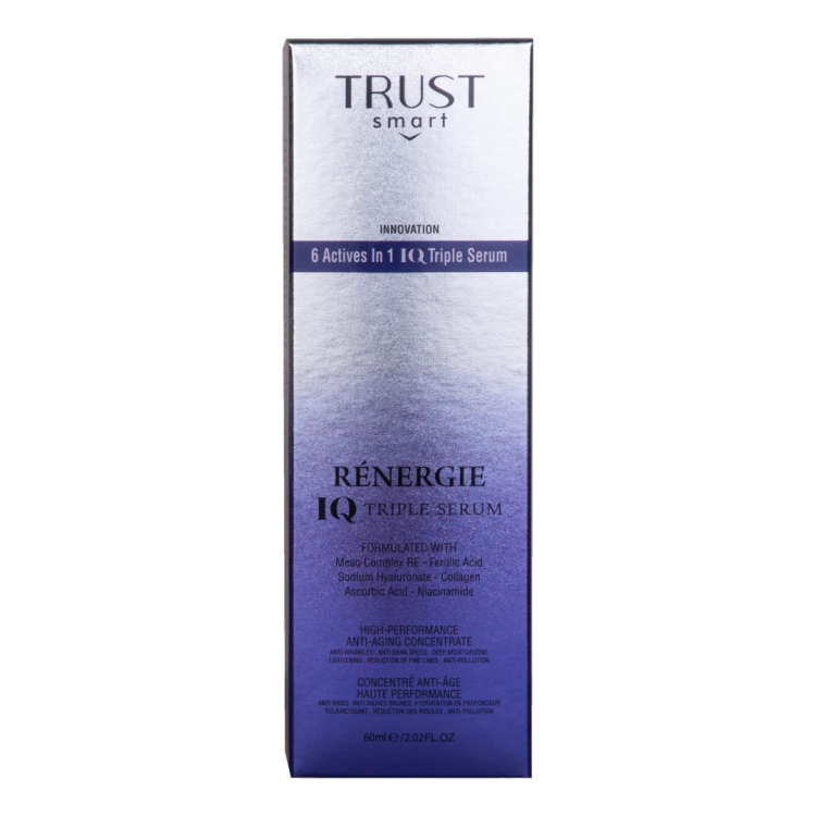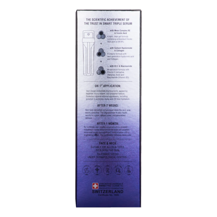 سرم سهگانه هوشمند تراست برای اولین بار به عنوان قویترین محصول حاوی سه نوع سرم روشنکننده، ضد چروک و جوانساز پوست در قالب یک محصول طراحی شده است. سرم روشنکننده حاوی ترکیبات فعال اصلی ویتامین C و نیاسینآمید است که به طور چشمگیری به رفع لکهای پوست و جلوگیری از تیرگی پوست ناشی از عوامل مختلف کمک میکند. این محصول با داشتن ترکیبات فعال فرولیکاسید و مزوکمپلکس آر ای در فرمولاسیون سرم جوانساز خود، توانایی بینظیری برای ساخت سلولهای جدید پوستی و بازسازی و جوانسازی پوست دارد. مزوکمپلکس مورد استفاده در فرمولاسیون این سرم، با داشتن انواع ترکیبات فعال پپتیدی، آمینواسیدها، هیالورونیکاسید، مواد معدنی و انواع ویتامینها، تاثیر منحصر به فردی در بازسازی و جوانسازی پوست دارد. کلاژن و هیالورونیکاسید مورد استفاده در فرمولاسیون سرم ضد چروک هم بعد از استفاده از سرم بر روی پوست تاثیر همافزایی با مزوکمپلکس و فرولیک در آبرسانی، رفع چین و چروکها و افزایش استحکام پوست دارد. بنابراین سرم سهگانه هوشمند تراست با داشتن سه نوع سرم با ترکیبات فعال آبرسان، افزایشدهنده استحکام پوست، جوانکننده و ضد چروک و روشن کننده پوست، به عنوان محصولی متفاوت و بینظیر به بازار معرفی گردید.